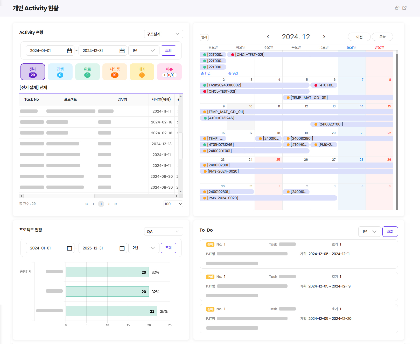 프로젝트별 업무 현황을 한눈에 확인할 수 있는 맞춤형 대시보드를 제공하여 프로젝트 진행을 효율적으로 관리할 수 있습니다.