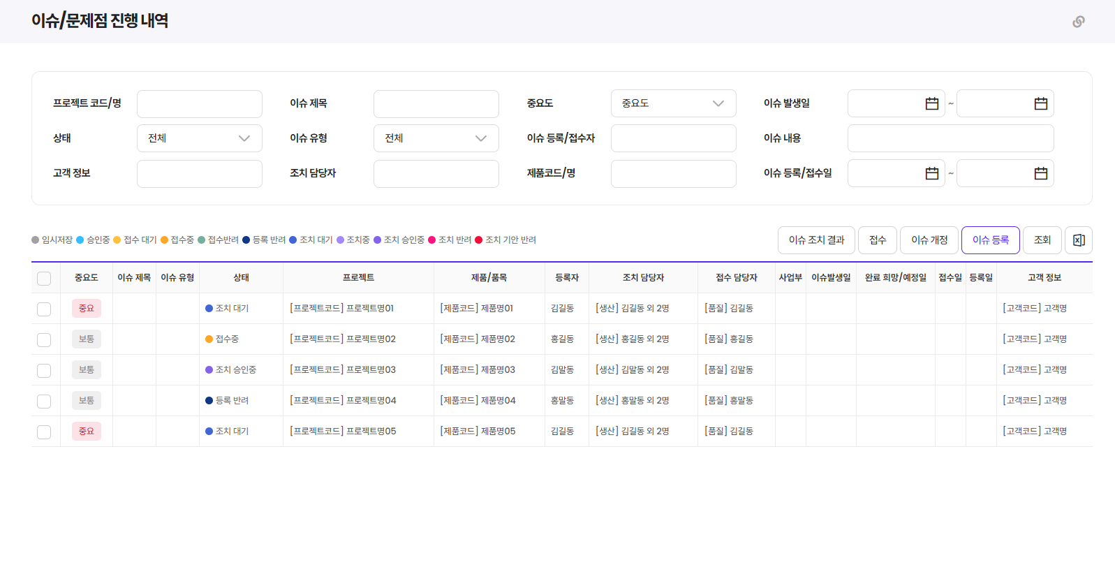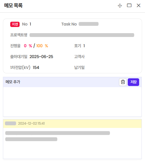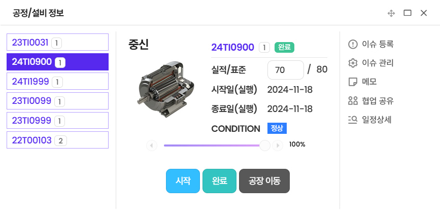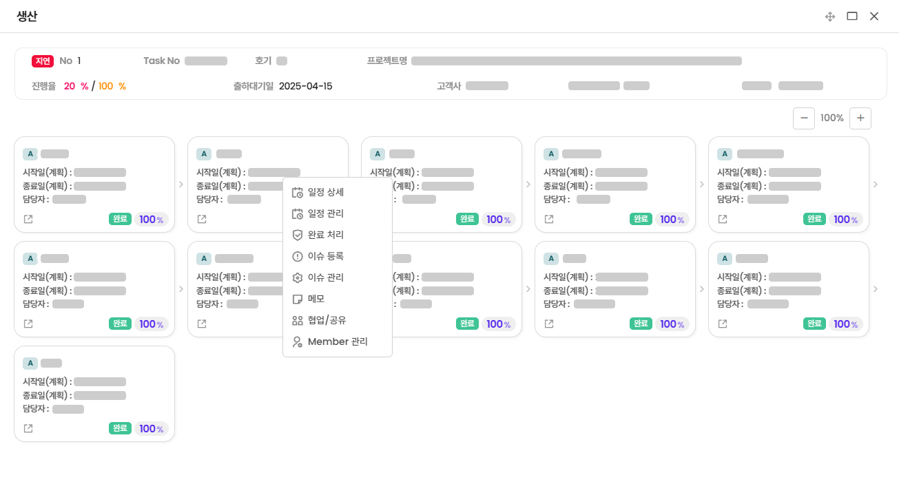 - 프로젝트별로 연계된 이슈, 문제점, 출하 일정, 생산 진행 현황 등 제공