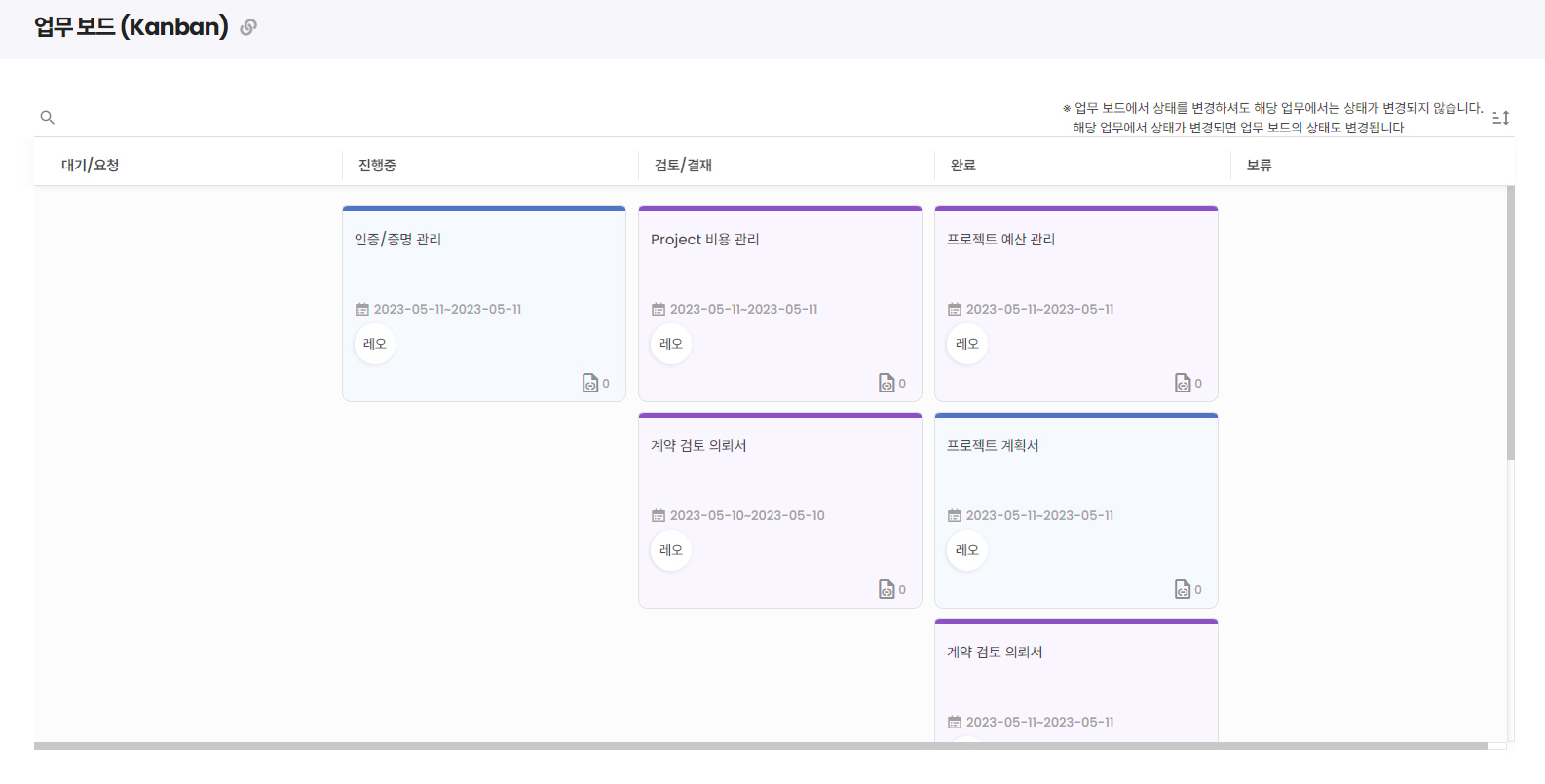 여러 프로젝트의 진행 현황을 한눈에 확인할 수 있는 Card형 프로젝트 목록을 제공하며, 효율적인 업무 수행이 가능합니다.