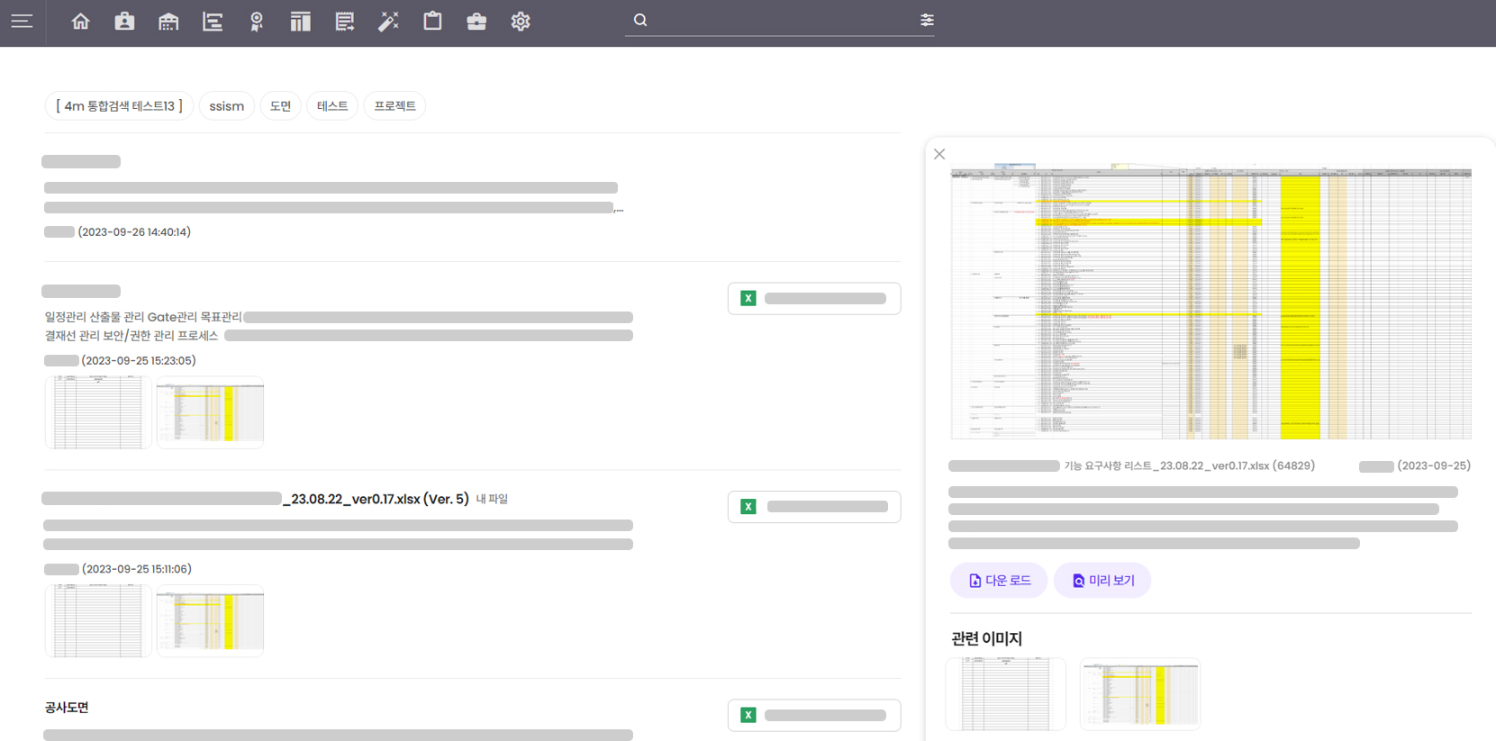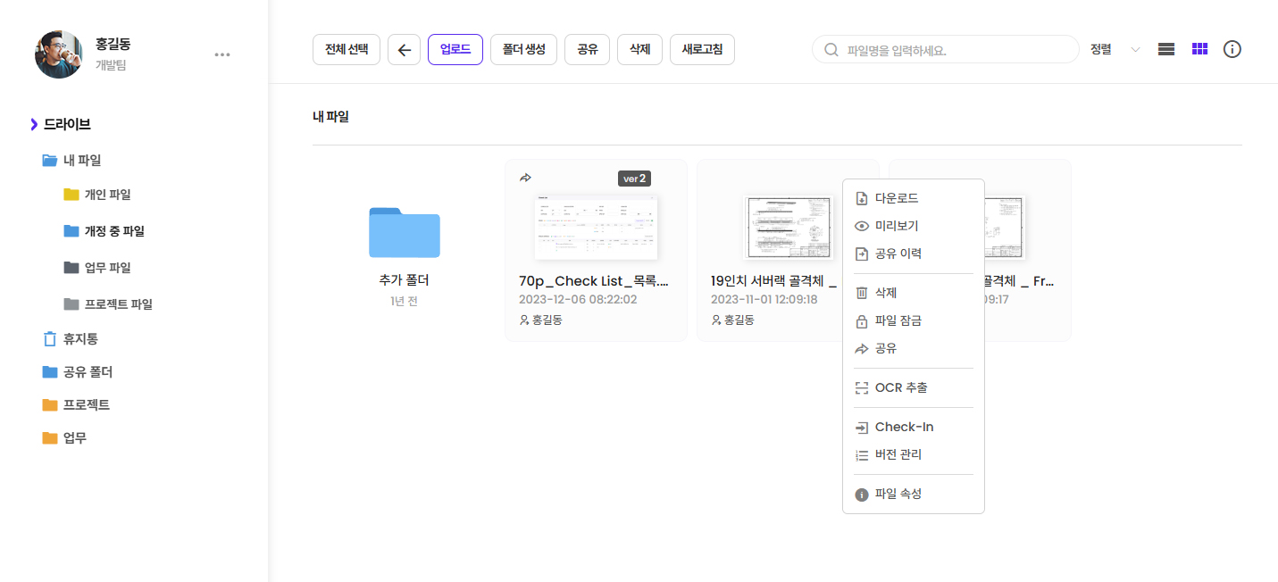 OCR 및 통합 검색 엔진을 활용하여 프로젝트 및 문서 내용을 빠르게 검색할 수 있습니다.