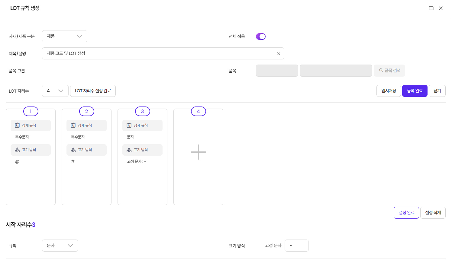 - 자재 및 제품의 LOT별 코드 체계를 사용자 정의로 설정 가능