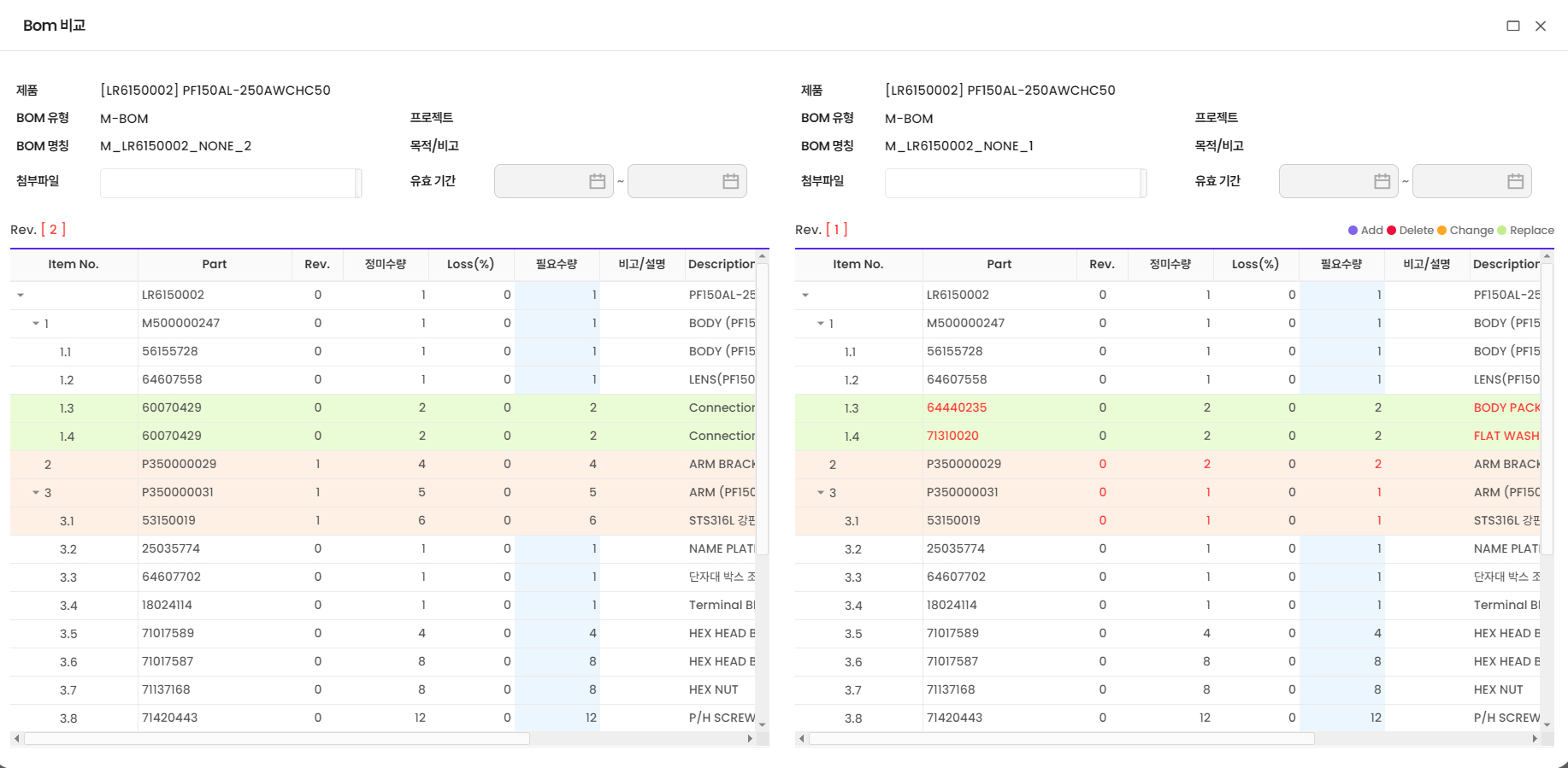 - BOM 비교 기능을 통해 제품별 BOM 변경 사항을 파악 가능
