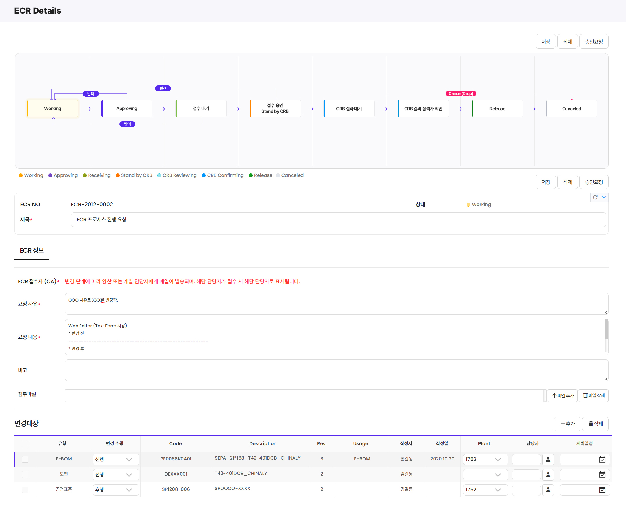 - ECRO, ECO, CRB, CCB 등의 변경 관리 프로세스를 지원