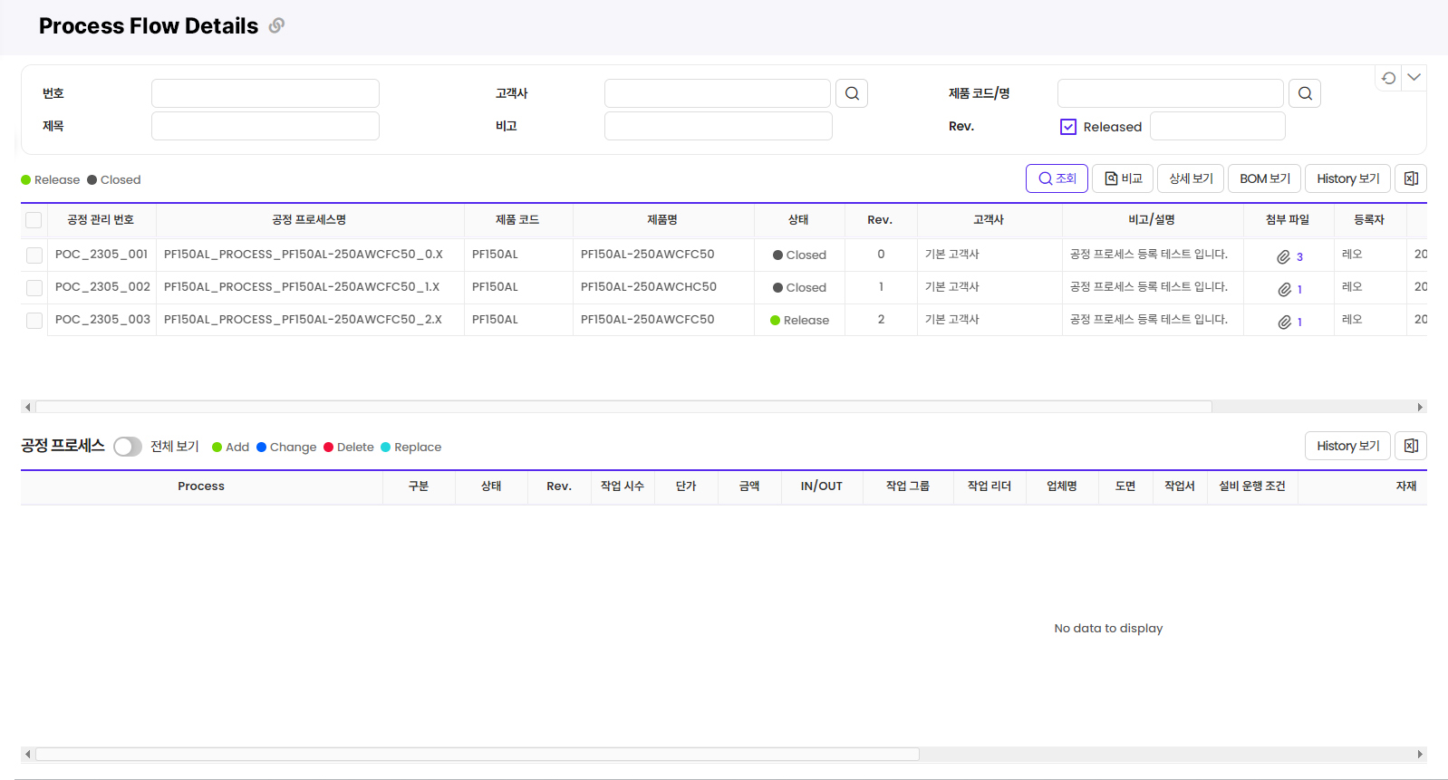 - BOM, Spec 등의 변경 내역을 비교하여 차이점 확인 가능