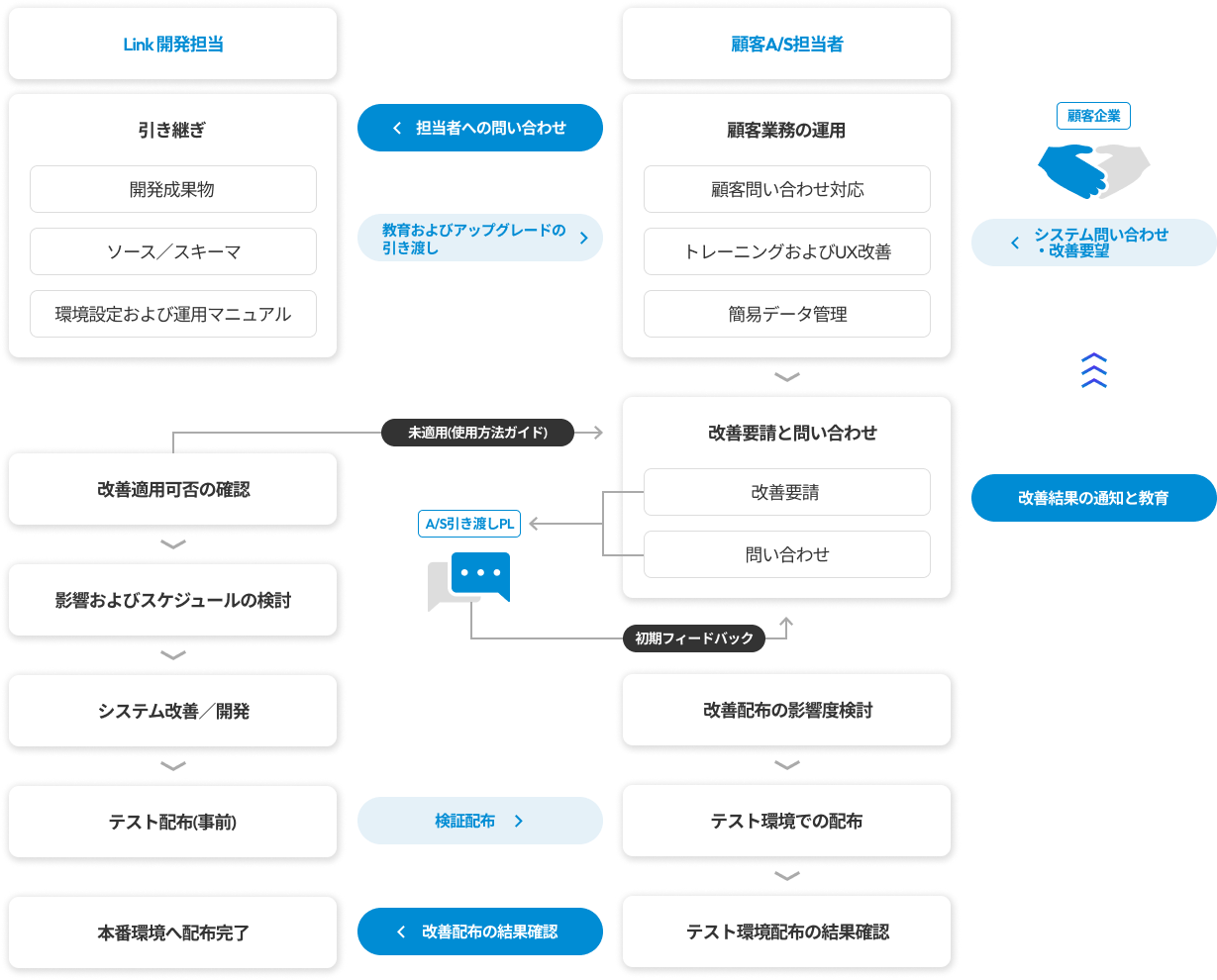 顧客対応および改善はA/S担当者(顧客との1対1マッチング)によって行われ、1・3・7レベルの対応方針に基づき安心なサービスを提供します。有償サービス利用時にはアップグレードおよび新機能開発も可能です。